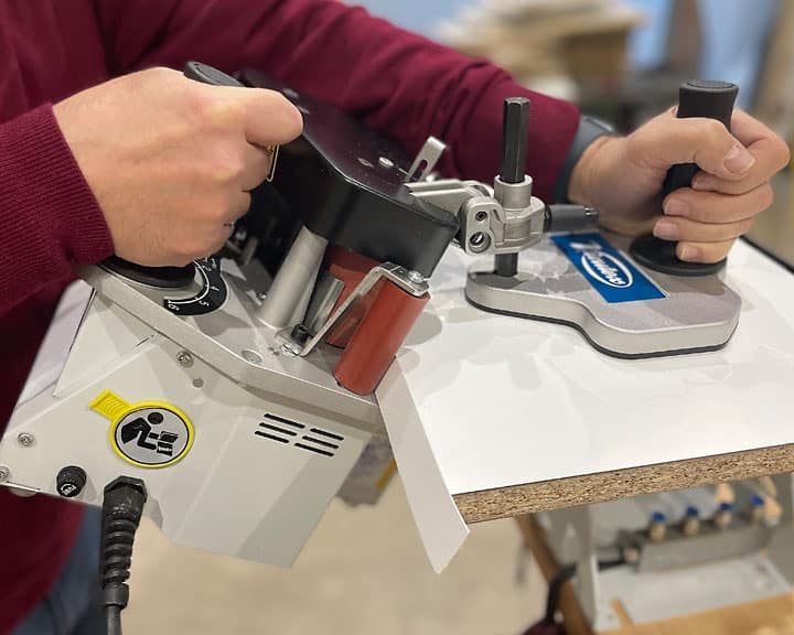 Aplacadora de cantos portátil con depósito de cola caliente. Temperatura de cola y velocidad de canteado regulables de forma electrónica.